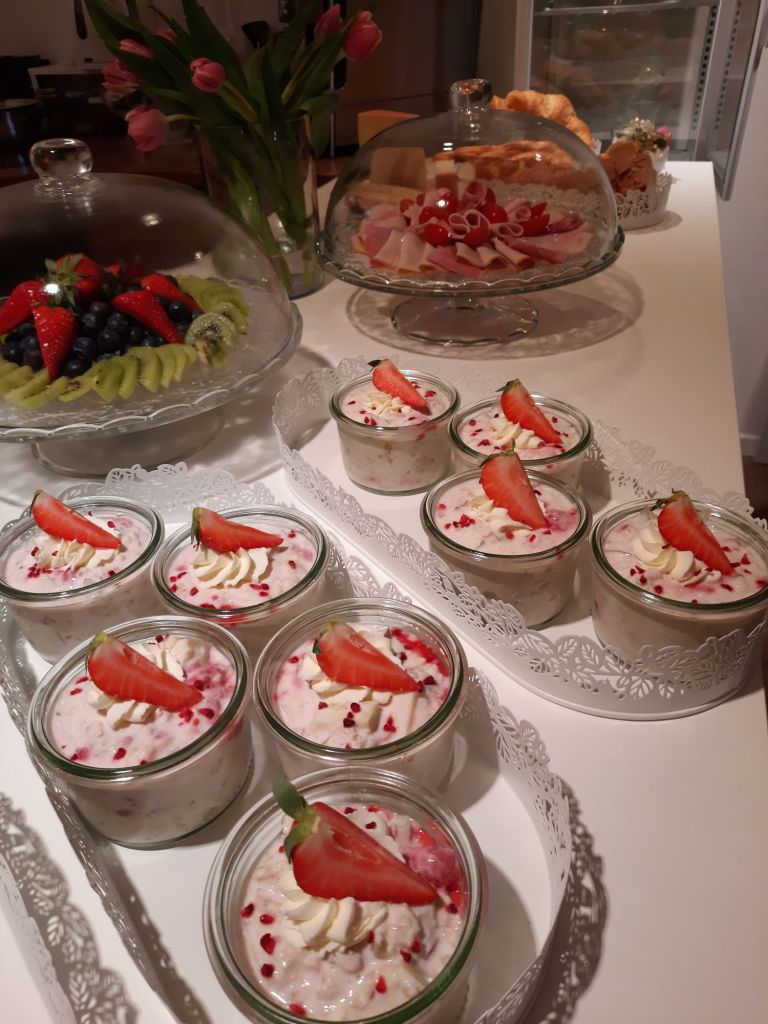 Beim Brunch, welchen ich ab 10 Pers. anbiete, erwartet dich ein Frühstücksbuffet mit Brot, Zopf, Gipfeli, hausgemachter Marmelade, Honig, Nutella ,Butter, Käseauswahl, Fleischauswahl, Birchermüesli, Früchte, Kuchen in Aperogrösse, O-Saft, Mineral, Hahneburger, Tee, Kaffee, Kaffeemilchmischgetränke und kalte/warme Schokolade. Gerne integriere ich auch Deine weiteren Wünsche wie Gemüsedip, Lachs, Rührei….