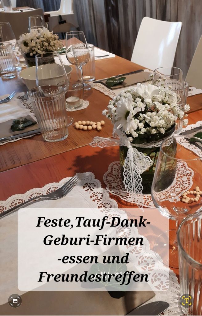 Gerne richte ich Dein Fest aus. Mit viel Herz koche ich einfache Menus und zaubere leckere Desserts für euch. Je nach grad der Festlichkeit freue ich mich darüber den einen oder andern zusätzlichen Blumenschmuck/Deko herzustellen.