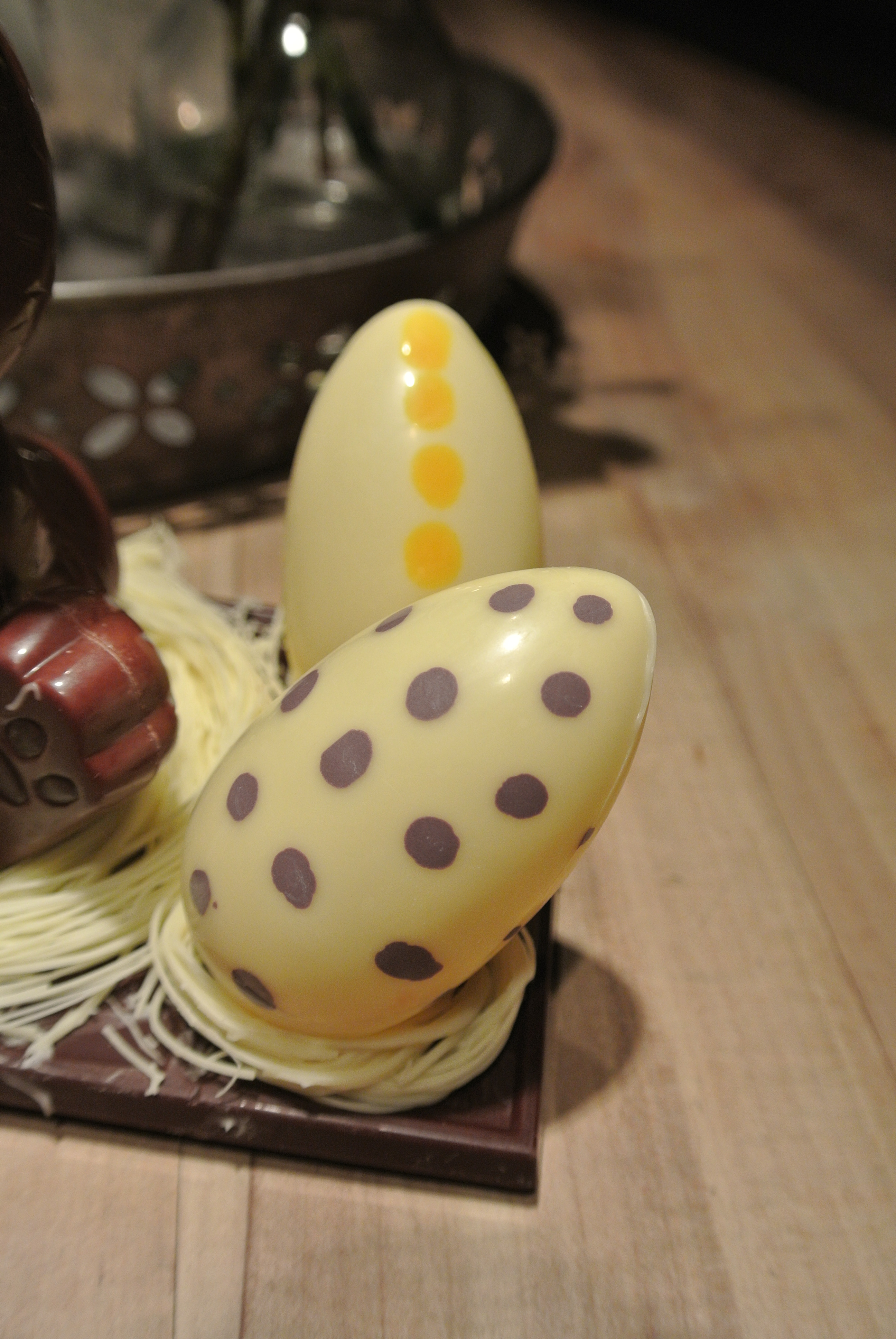 Sogar Schokoladen-Nestli lassen sich herstellen..das feine weisse unter den Schokoeiern und rund um den Hasen ist Schokolade. Absolut faszinierend…