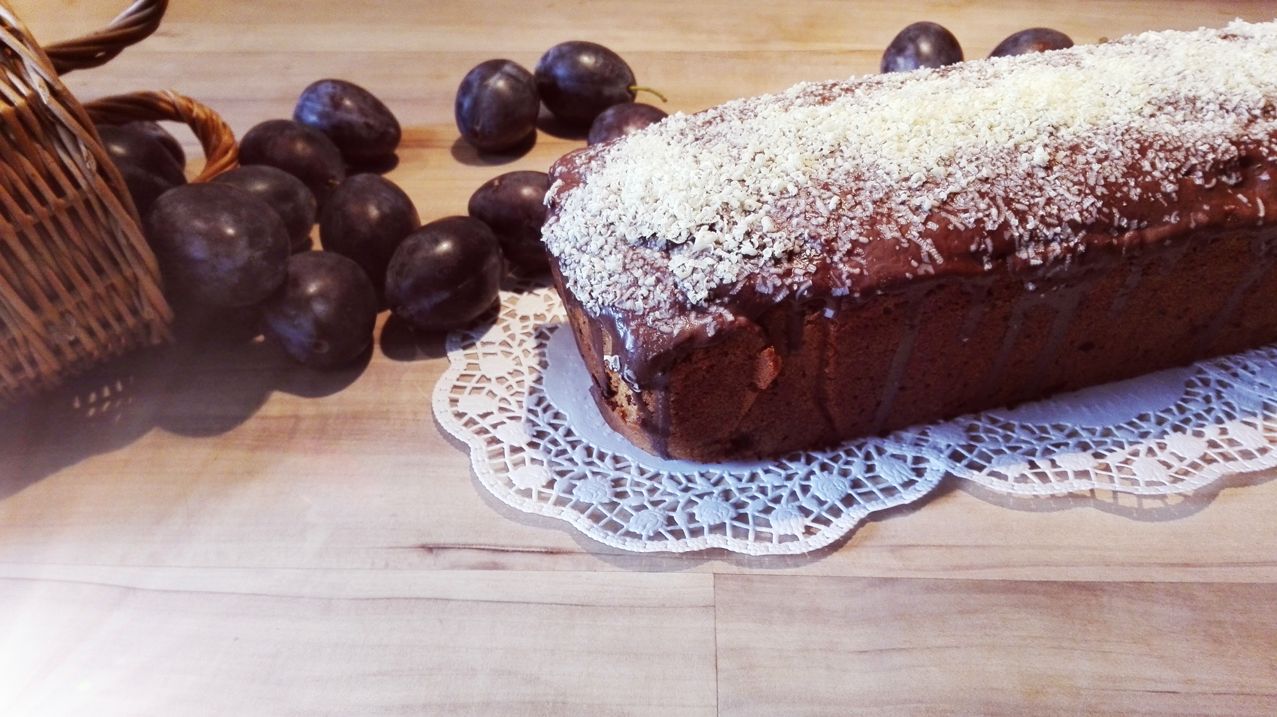 Ich schmolz 100g dunkle Schokolade und 20g Kokosfett. Gab sie danach über den Cake. Wenig weisse Schokolade rieb ich an einer feiner Raffel und gab sie über die dunkle Kuchenglasur.
