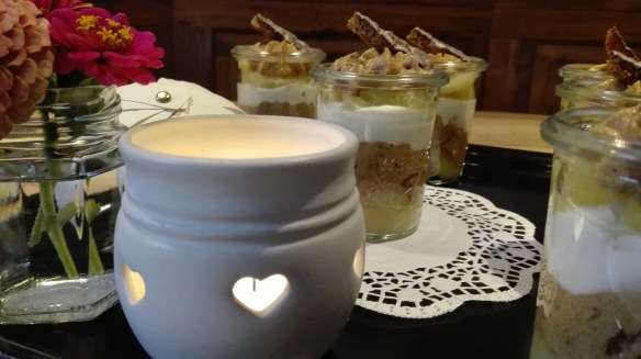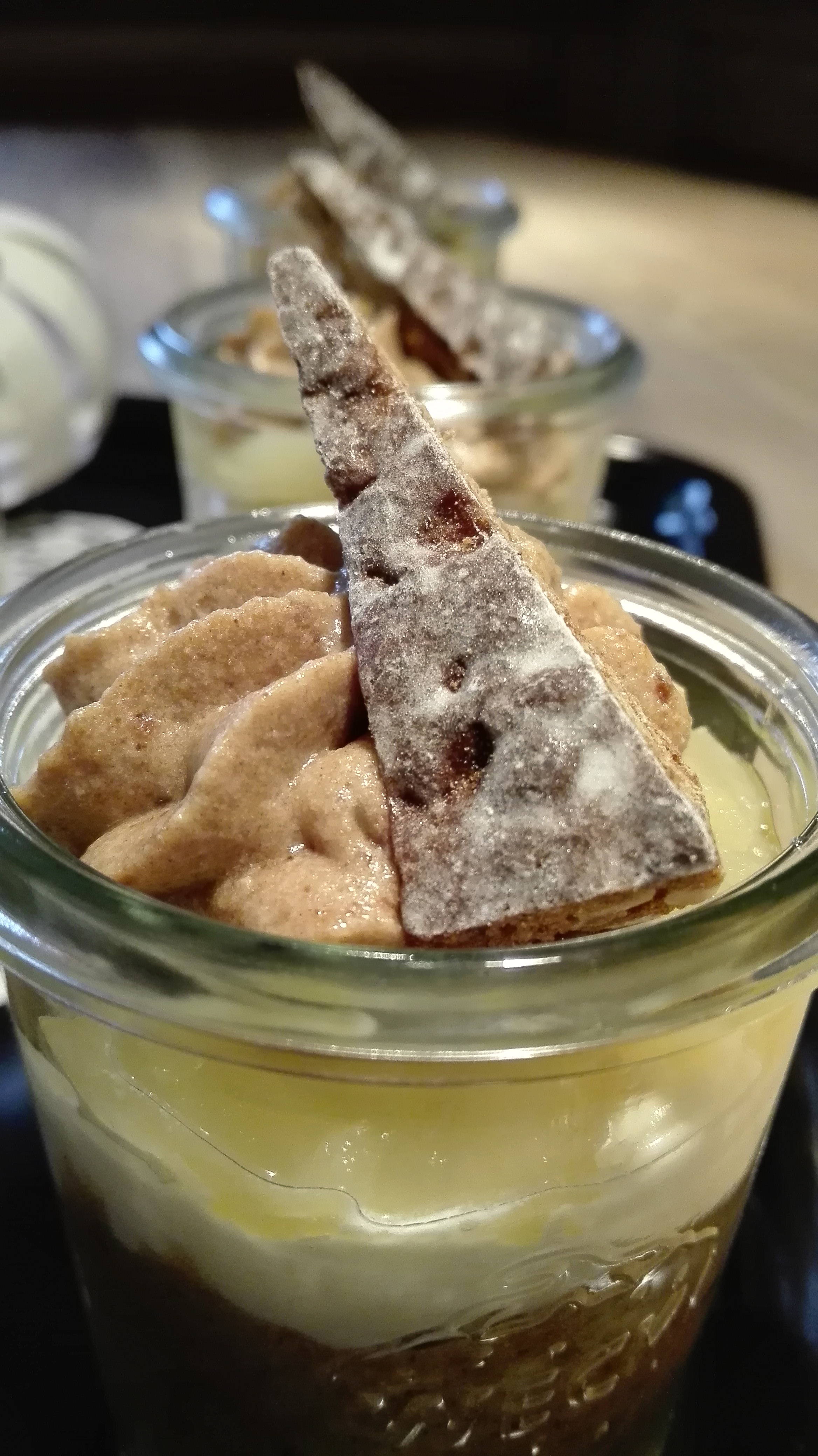 Äpfel/Läckerli-Mousse/ Quarkcreme /Äpfel/Läckerli-Mousse/ Deko: Läckerli-Dreieck