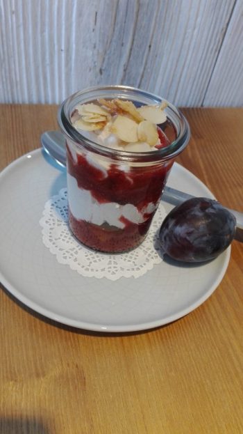 So gabs ein Zwetschgendessert im Glas. Zwetschgenmus mit Frischkaese-Quark-Zimtcreme oder – erfrischender Herbst im Mund-.Was ich besonders mag, sind die leicht caramelisierten Mandelblättchen obendrauf. Die sorgen jeweils für einen knusprigen Crunch.