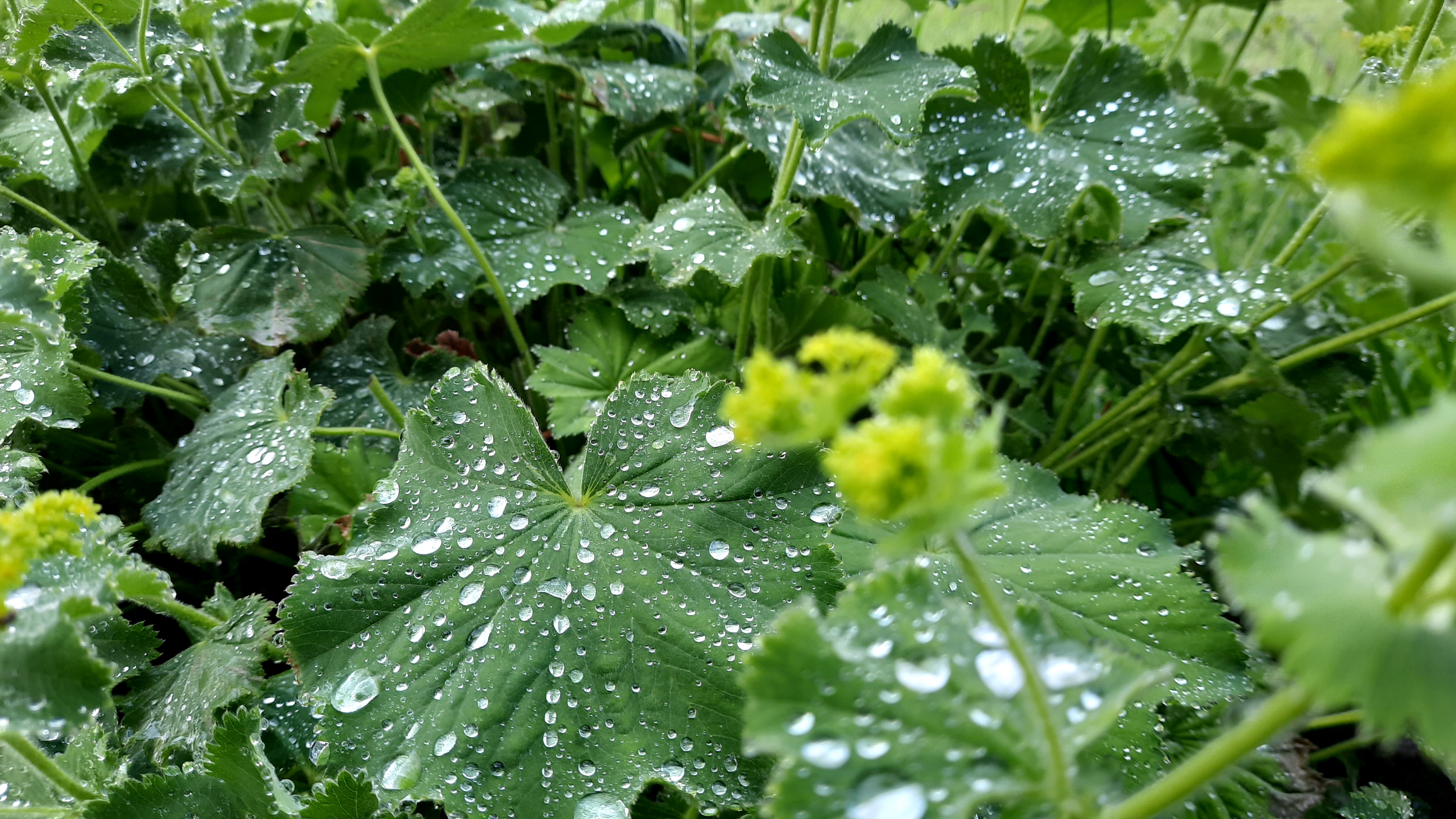 …darum ein Foto aus meinem Garten. Ich bin total fasziniert über die silbernen Regentropfen auf den Blättern des Frauenmantels und es ist eine gute Sache stehen zu bleiben und im realen Leben, Natur-Pur-Schauspiele aufzusaugen.