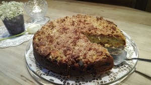 -Die 400g Rhabarberwürfel darüber streuen, bezuckern mit 2-4 EL Zucker. Danach die Streusel darüber geben.