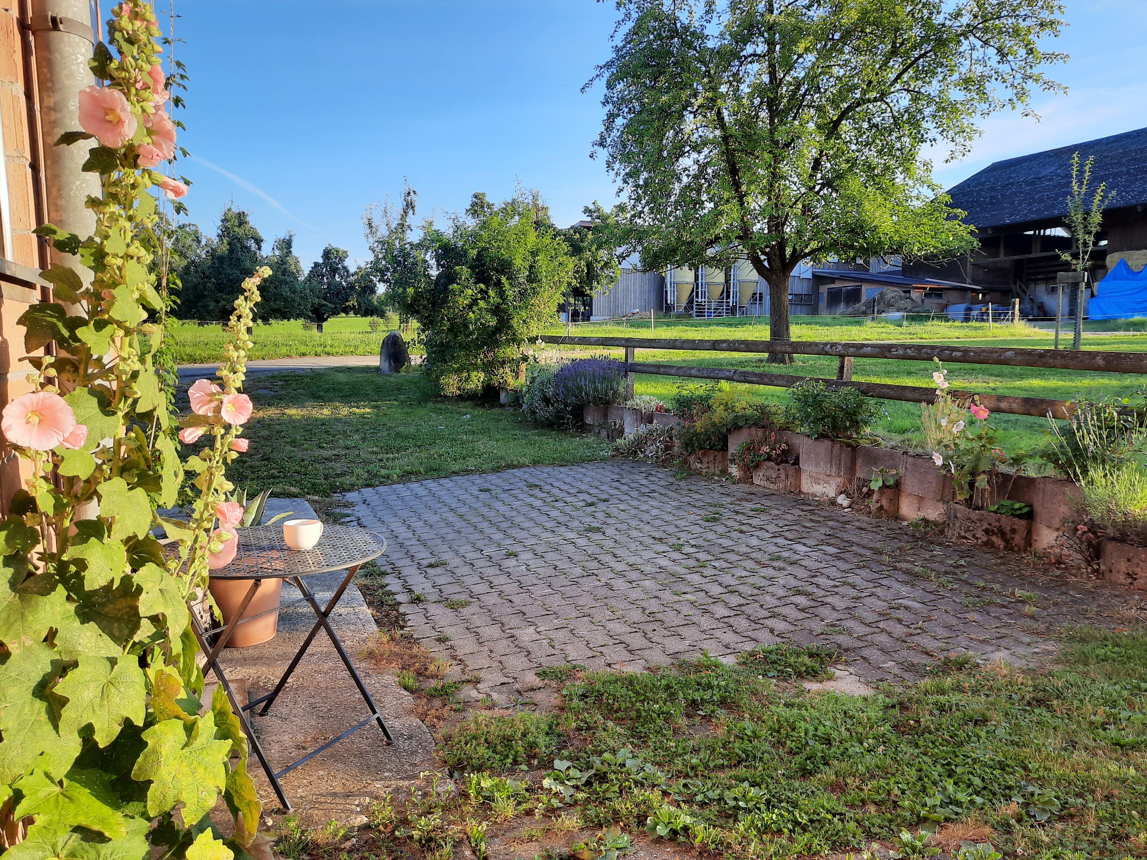 Bei der Westseite unsres Hofes, an unsrer kleinen Rosenstrasse haben wir 1 Platz um ein Wohnmobil/Wohnwagen zu stellen. Bei schönem Wetter kannst Du den Tag mit Abendsonne ausklingen lassen und den Kühen im Nahe gelegenen Stall(100m) zuschauen. Jeweils Di und Sa besteht die Möglichkeit, den Tag mit einem leckeren Frühstück in meinem Hofcafe zu beginnen.