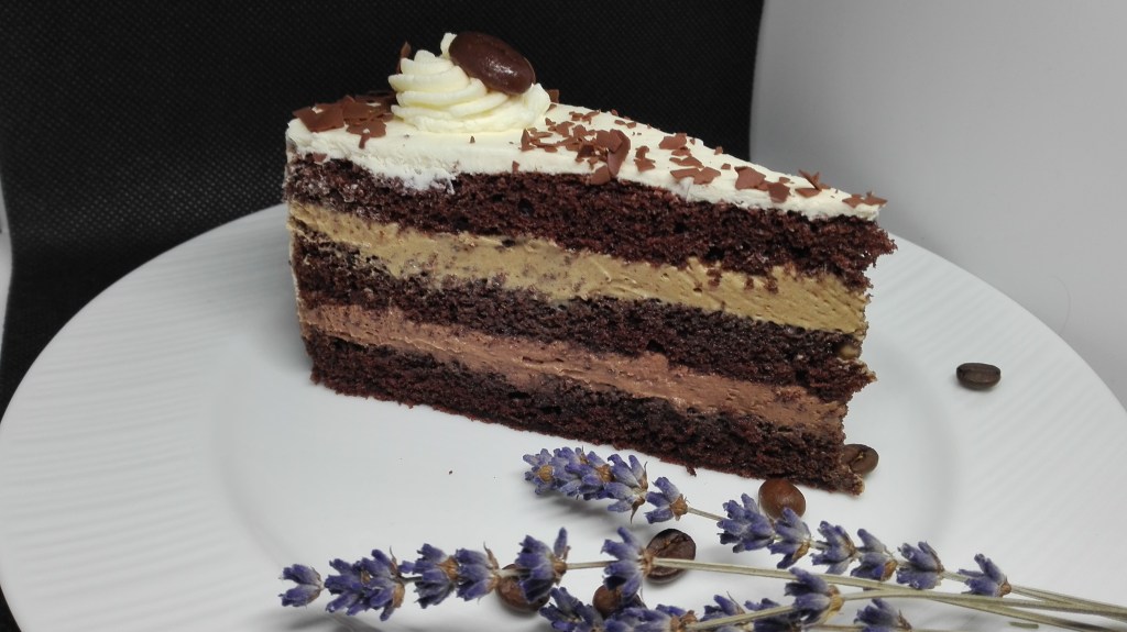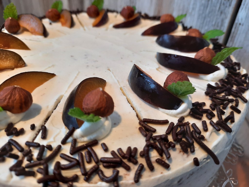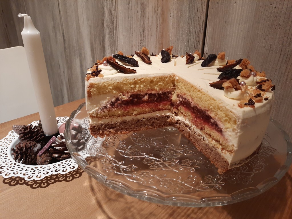 Schokoladenbiskuit gefüllt mit dunkler Ganache, Marronirahm, Marmelade, auf Wunsch mit Fruchtstücken (Trauben/Birne)