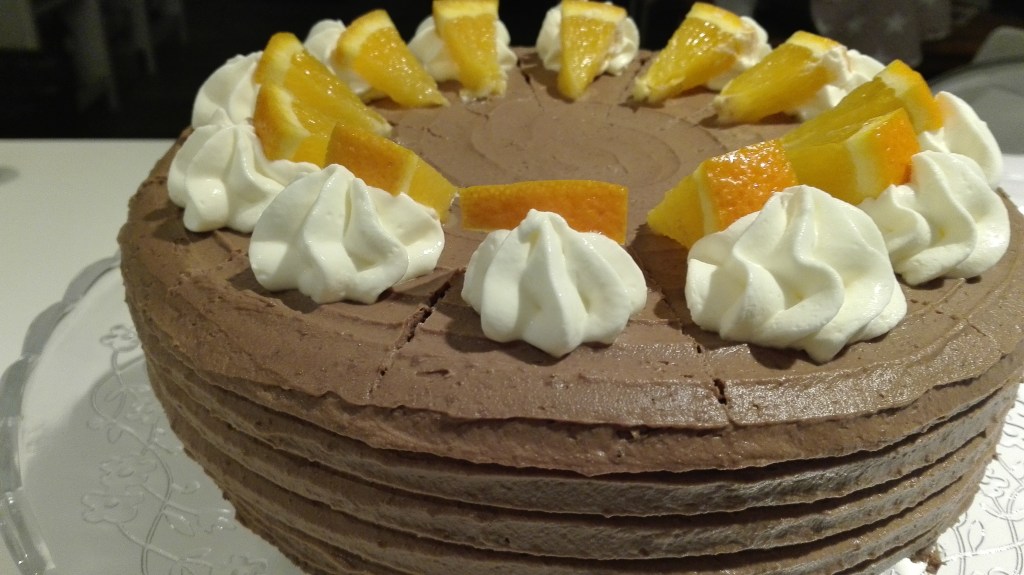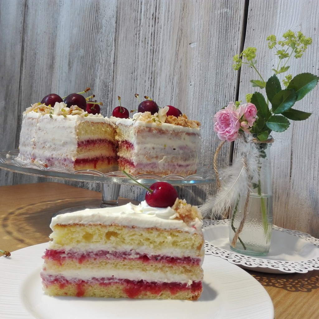 Schokoladenbiskuit gefüllt mit Marmelade/Sauerkirschen/Kirsch, Rahm