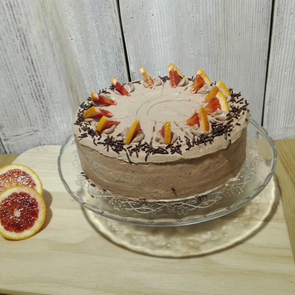 Schokoladenbiskuit, gefüllt mit dunkler Ganache, Rahm, caramelisierten Erdnüssen, Peanutbutter, Orangenmarmelade